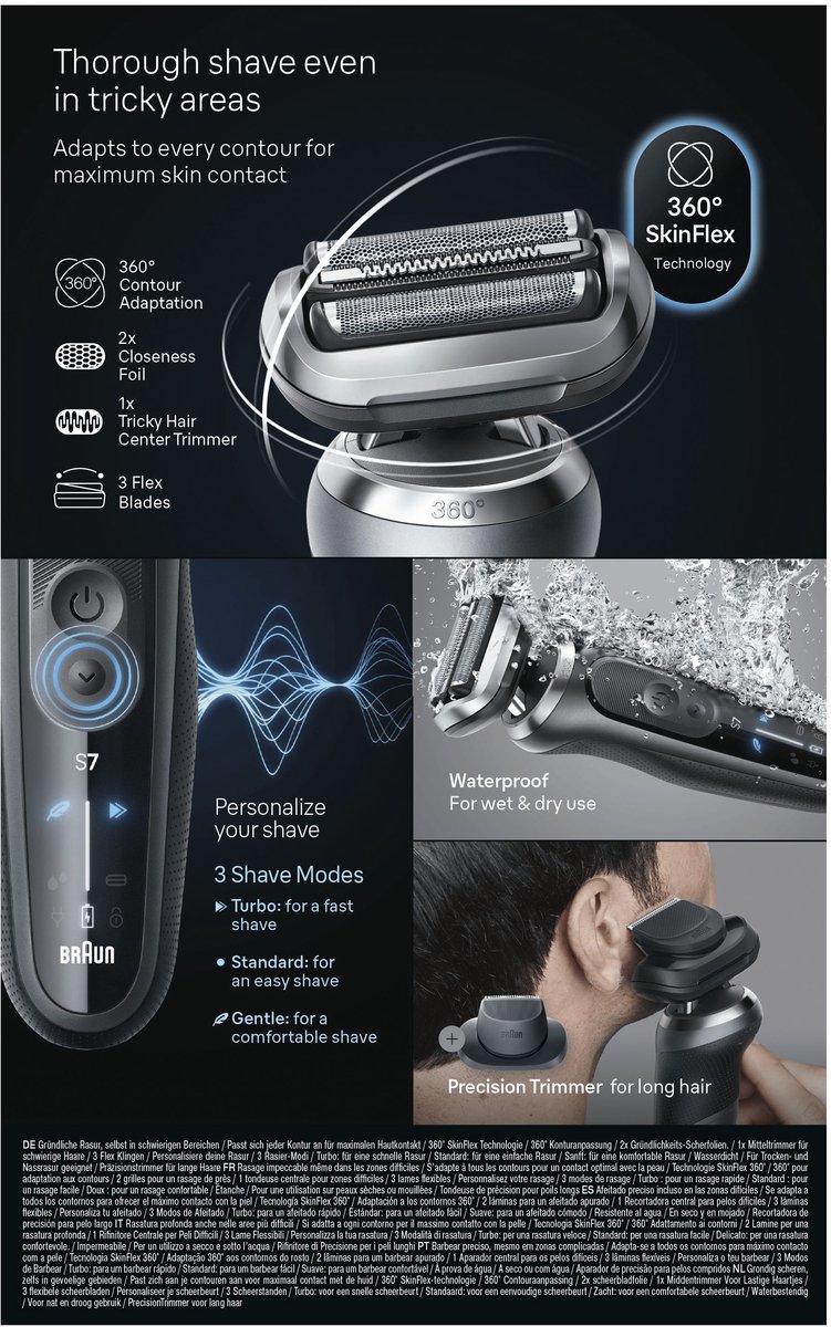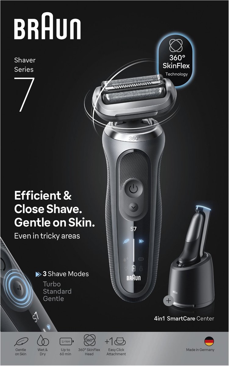 Het Braun Series 7 is ontworpen voor een optimale scheerervaring. Dankzij de innovatieve 360° SkinFlex-kop en drie flexibele scheerbladen past het apparaat zich moeiteloos aan alle contouren van je gezicht aan. Dit betekent dat zelfs lastige plekjes, zoals onder de neus of rond de kaaklijn, vakkundig worden meegenomen. Het resultaat? Een uiterst glad en comfortabel scheerresultaat in minder tijd.