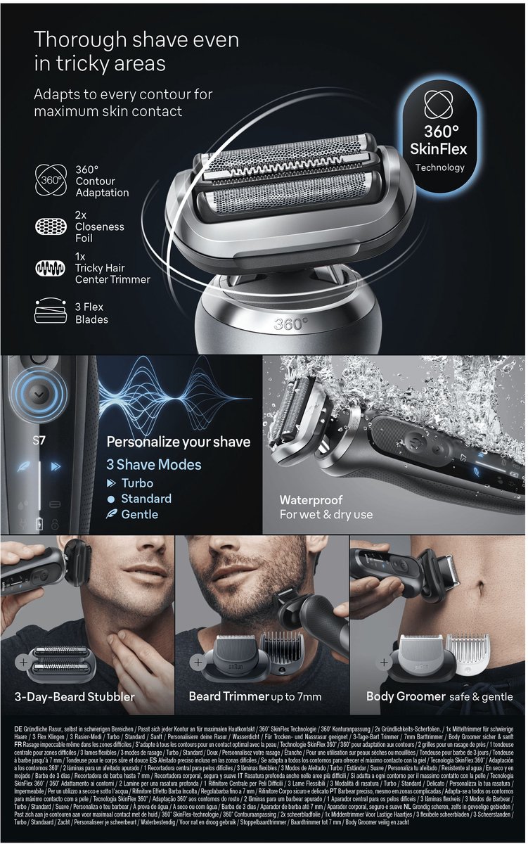 Met het Braun Series 7 elektrische scheerapparaat geniet je van een snelle, comfortabele en uiterst gladde scheerervaring. Dankzij de geavanceerde technologie en het uitgebreide accessoirepakket wordt dagelijks onderhoud eenvoudig en plezierig. Upgrade je grooming routine en ervaar het verschil dat kwaliteit en innovatie maken.