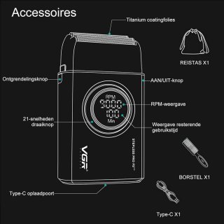 - Lange gebruiksduur: de 1.400 mAh oplaadbare batterij geeft tot 100 minuten scheertijd na slechts 2 uur opladen.