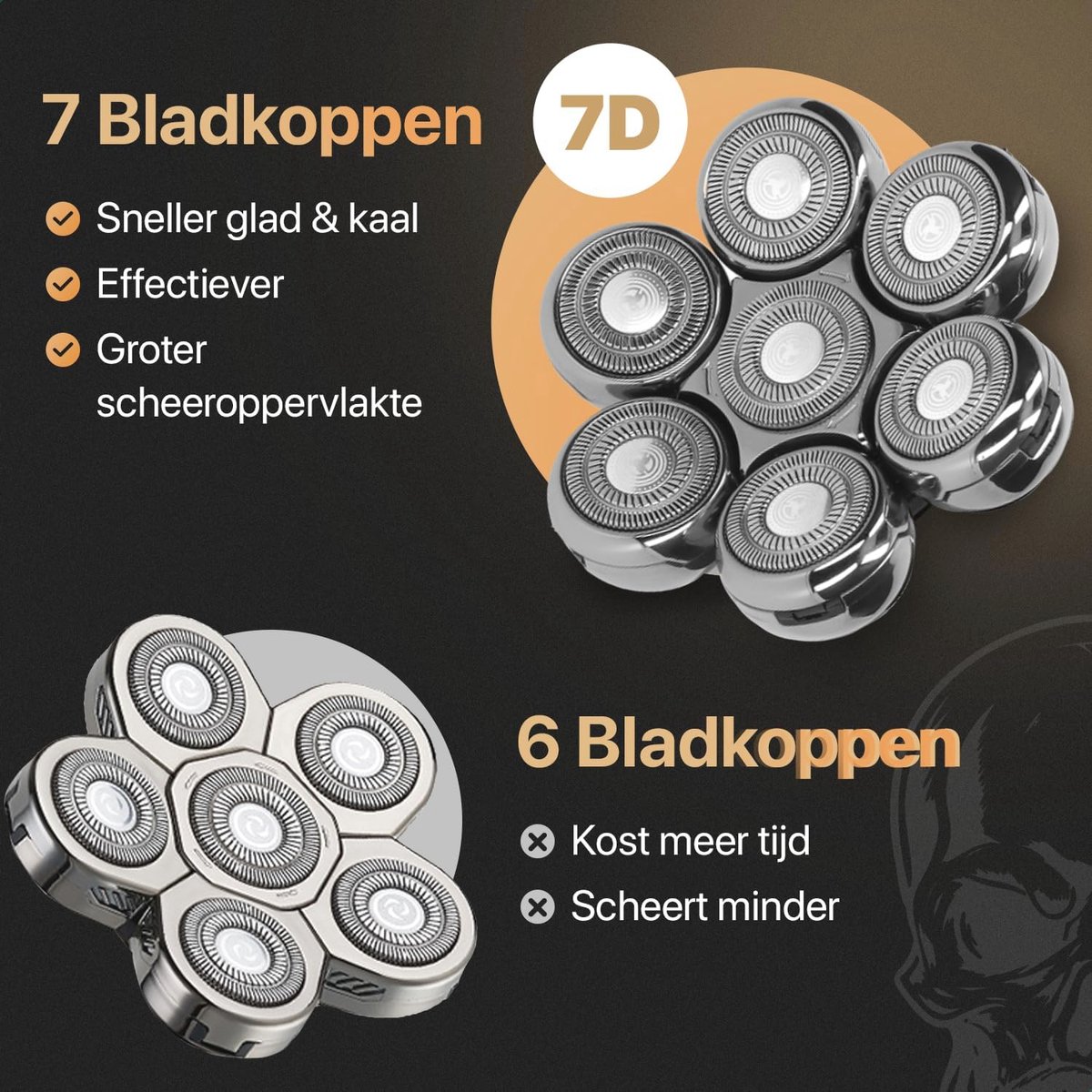 - 7 flexibele roterende scheerkoppen die perfect de contouren van je hoofd en gezicht volgen – voor een glad resultaat zonder huidirritatie.
