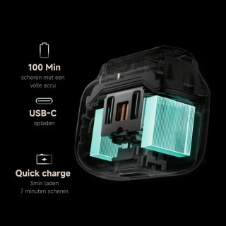 Een volle batterij levert tot wel 100 minuten draadloos scheerplezier. Zit je in tijdnood? Met de quick charge functie is 3 minuten opladen al goed voor ongeveer 7 minuten gebruik. De accu wordt via een USB‑C kabel opgeladen (ongeveer 2 uur voor volledige lading) en het toestel heeft een batterijindicator zodat je altijd weet hoeveel power je nog hebt.