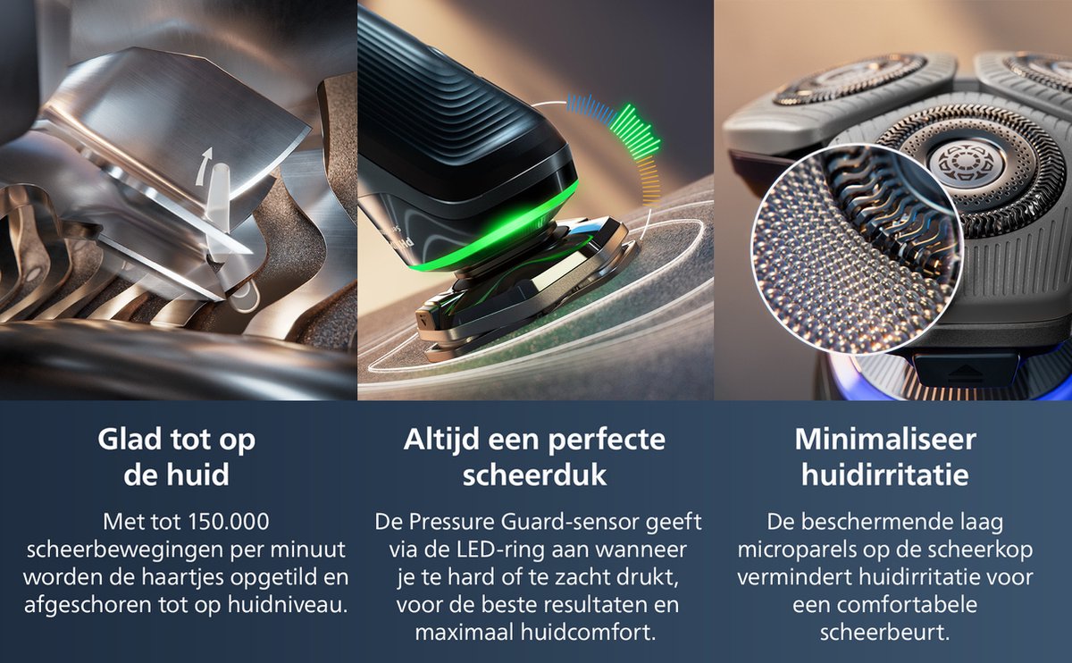 - Persoonlijke scheerprecisie: De Pressure Guard-sensor houdt je scheerdruk constant in de gaten en geeft via de LED-ring duidelijke feedback. Zo weet je precies wanneer je te hard of te zacht scheert, voor een perfect gebalanceerde en zachte scheerbeurt.