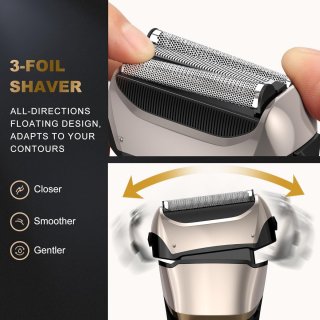 De flexibele, drievoudige foliekop past zich automatisch aan de rondingen van je gezicht aan en beweegt soepel mee. Zo worden ook lastig bereikbare plekken onder de kaaklijn en rond de hals effectief gladgeschoren. De folie voorkomt huidirritatie en zorgt voor een comfortabele scheerbeurt, elke dag opnieuw.